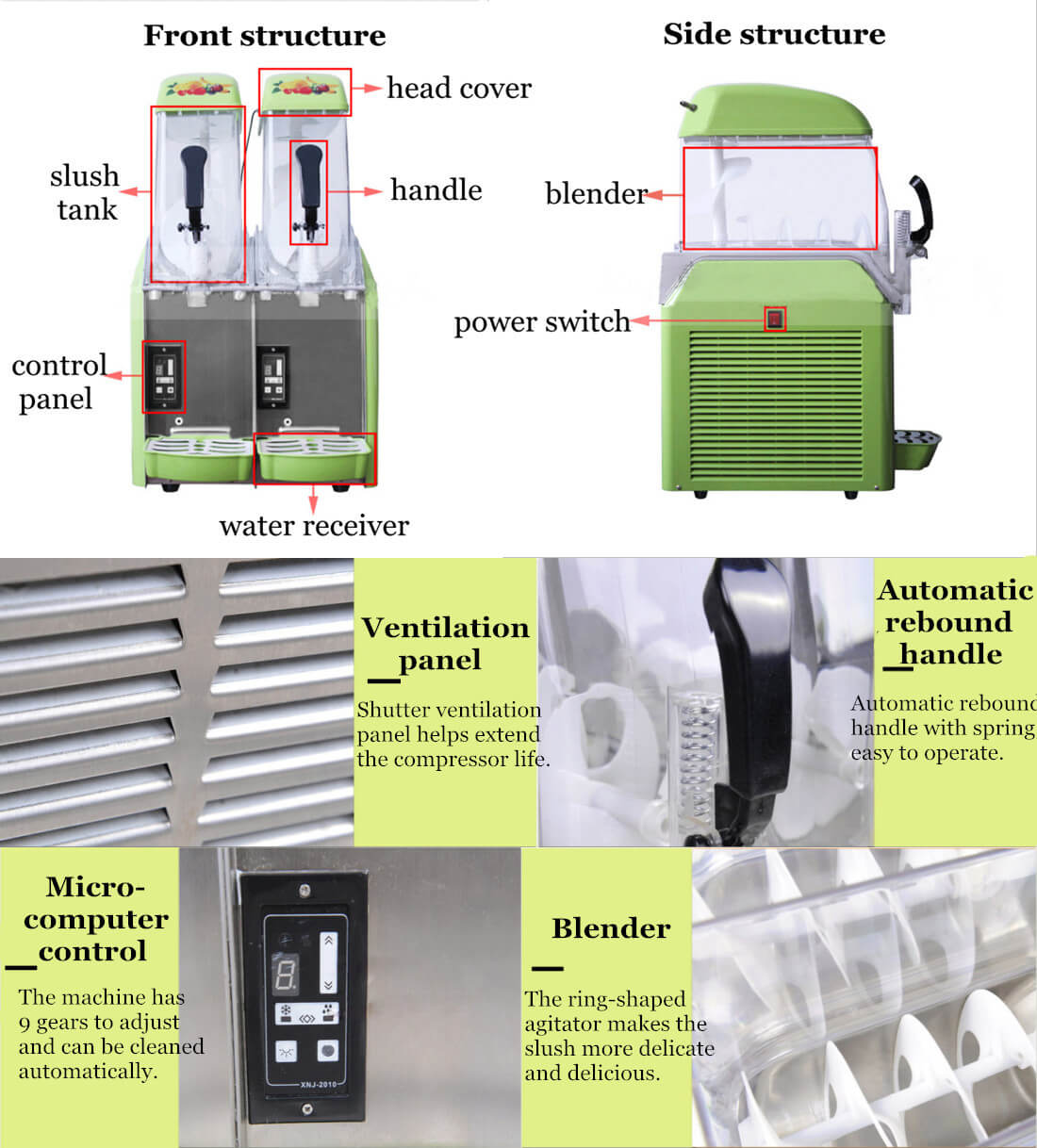 1. It can dispense a variety of frozen beverages such as granita drinks, frozen cocktails, fruit juices, smoothies, coffees, cappuccino and tea slush beverages and so on